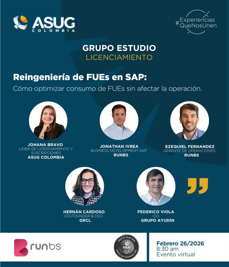 La Dirección de Educación de ASUG Colombia te invita a la sesión “Reingeniería de FUEs en SAP”, donde conocerás cómo optimizar el consumo de licencias a través del análisis de roles y autorizaciones, sin afectar la operación.